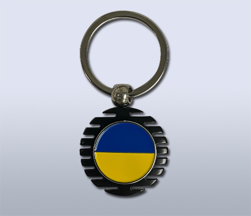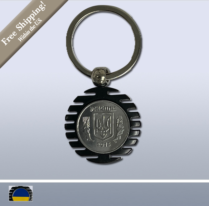 This handsome swivel key chain has a real Ukrainian 5 kopiiok coin featuring the shield with the arms of Ukraine with an oak leaf in front and two ears of wheat behind along with the country name at the top and the date at the bottom. The flip side features the colors of the Ukrainian Flag. Made from a zinc alloy.