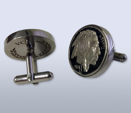 These stainless steel cufflinks feature genuine, hand enameled buffalo nickels . The set will feature the Indian head side of the coin on each cufflink.