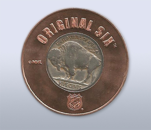 This stunning ball marker commemorates the Detroit Red Wings birth date with an original 1926 buffalo head nickel and is encased in copper inscribed with the team's name and on the flip side with "Original Six" and the official NHL logo . Each ball marker measures 1 7/16" and comes in a protective, drawstring pouch.