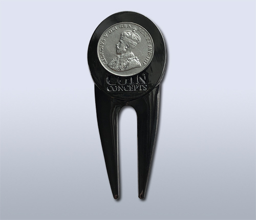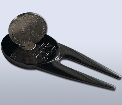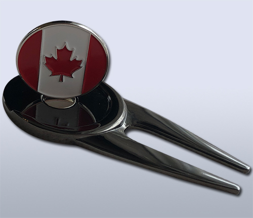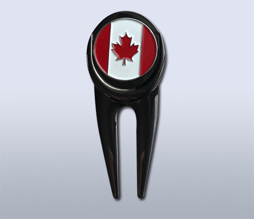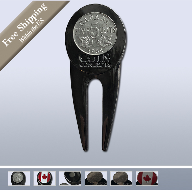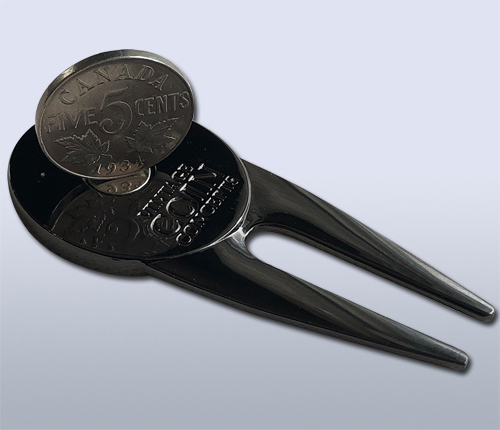 This unique metal divot repair tool with a black nickel finish has a magnet on both sides to hold a Canadian themed ball marker on one side and a genuine pre-1937 Canadian nickel on the other. Most coins are not magnetic, however, coins made of nickel or steel are magnetic. Canadian nickels are made of real nickel whereas American “nickels” are only 25% nickel. The Canadian nickels are magnetic, but U.S. nickels are not.