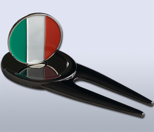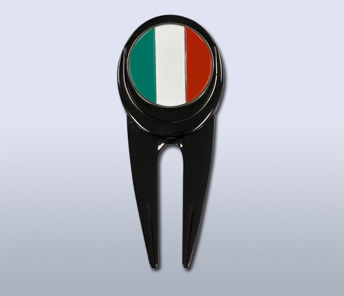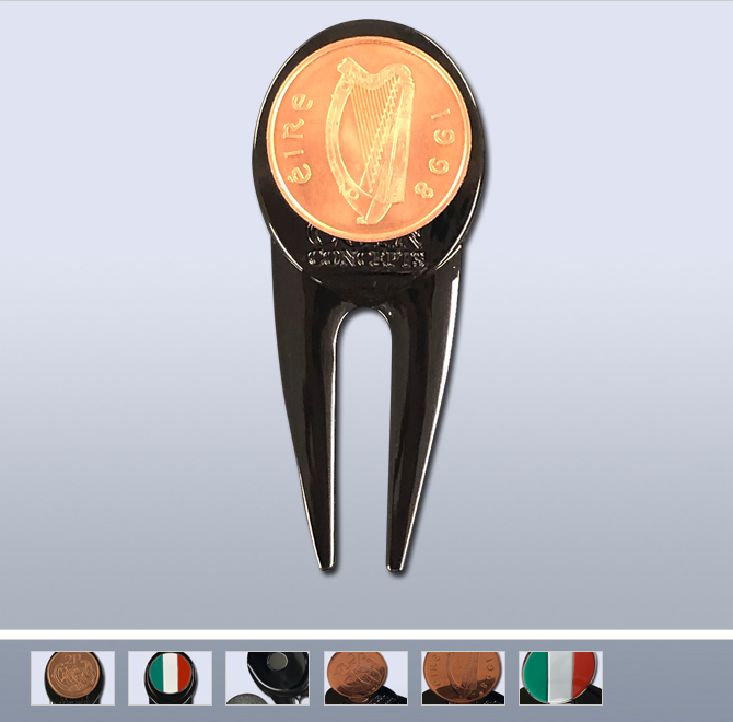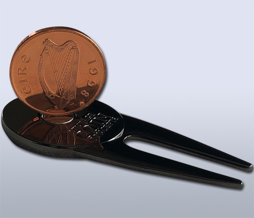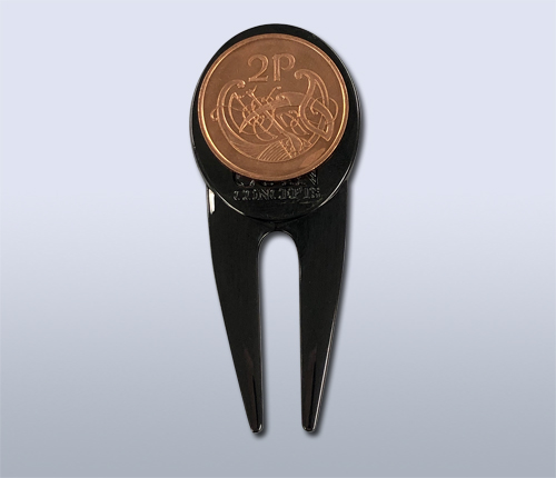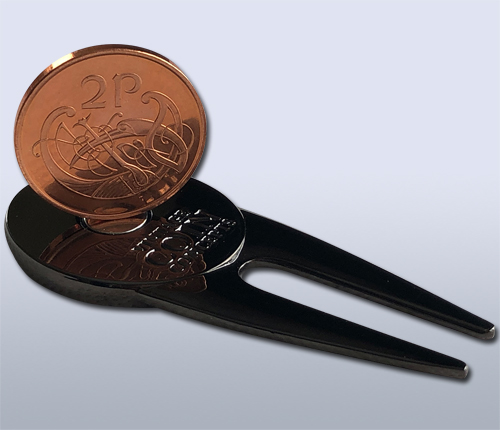 This unique metal divot repair tool with a black nickel finish has a magnet on both sides to hold an Irish themed ball marker on one side and a genuine copper Irish 2 pence on the other. Most coins are not magnetic, however, coins made of nickel or steel are magnetic. Irish 2 pence coins from this time period were made of steel. The diameter of this coin is a little larger than an American quarter.